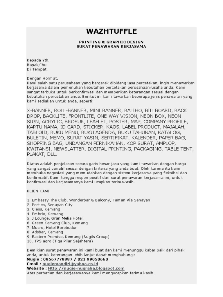 Contoh surat penawaran harga percetakan. Check spelling or type a new query. We did not find results for: Maybe you would like to learn more about one of these?